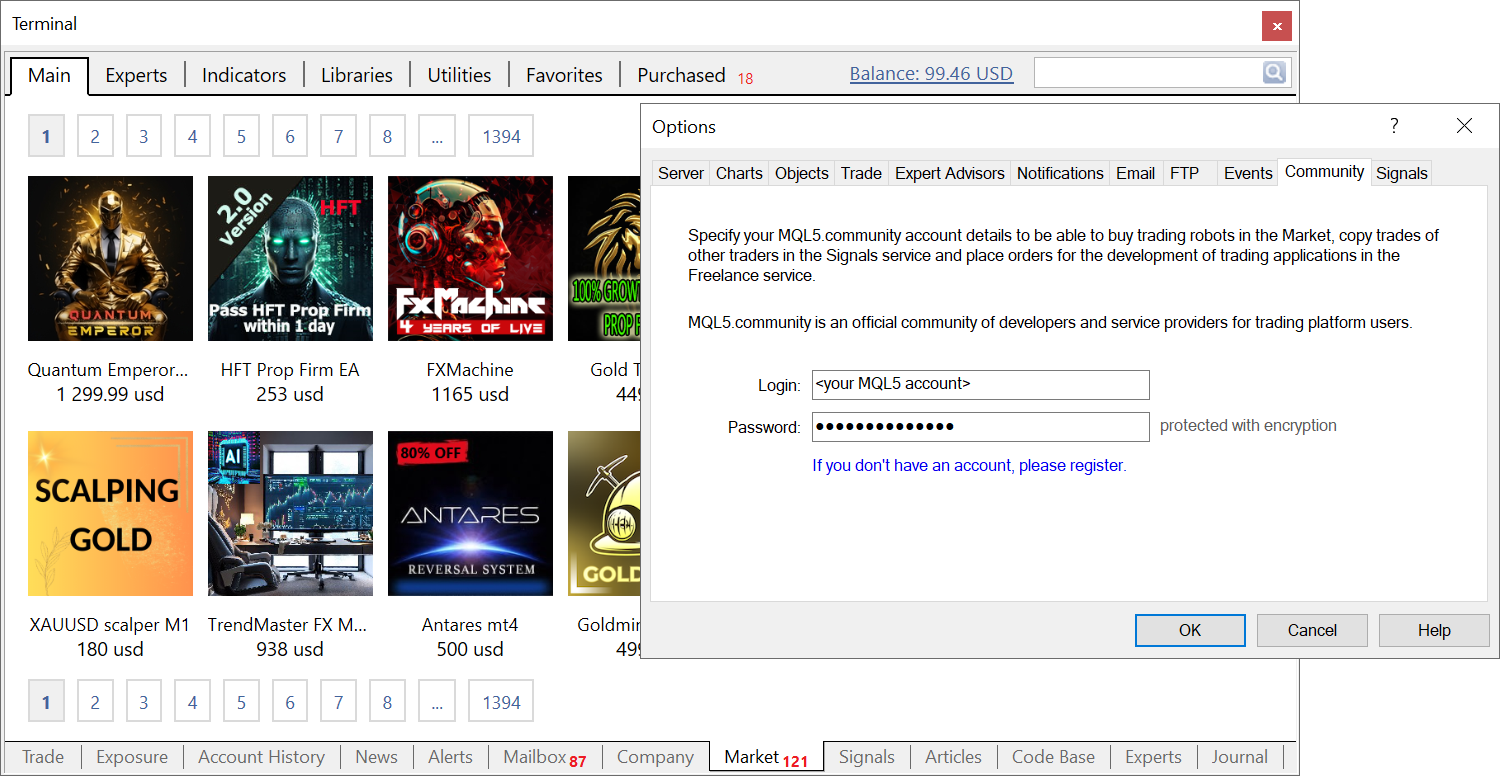 - マーケットセキュリティシステムの改善。ここで、製品を実行するためには、製品を購入したのと同じMQL5アカウントで、ユーザーがプラットフォームで認証されている必要があります。アカウントは[ツール]>[オプション]>[コミュニティ]で指定する必要があります。