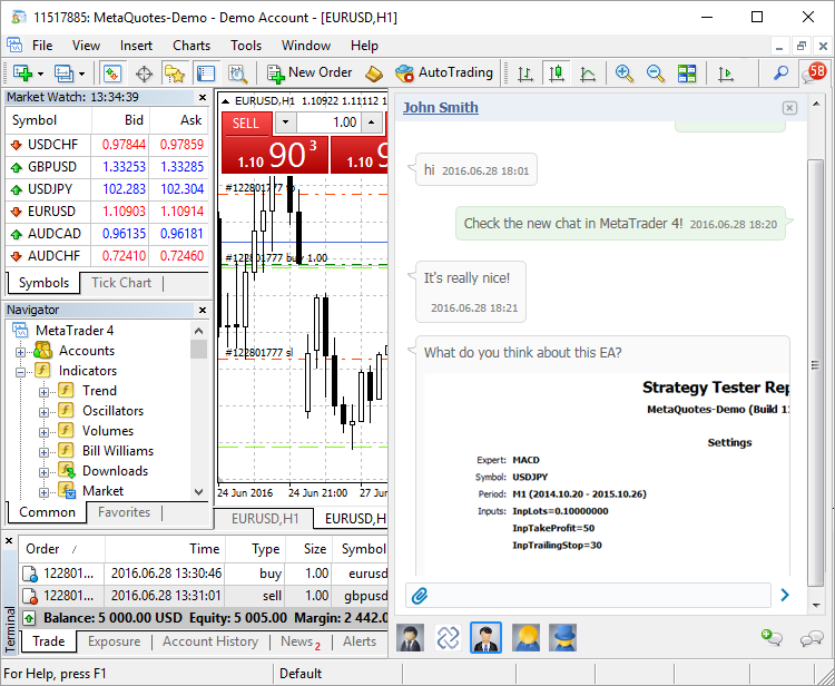 新バージョンには、トレーダーと他のMQL5.communityメンバーのチャットを可能にする無償のチャット機能が内蔵されています。メッセージ受信者のセクションに相手のユーザーのログインを指定し、そのモバイルデバイスに直接メッセージを送信します。