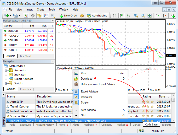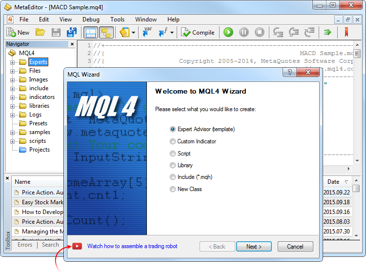 MQL4マスターにチュートリアルビデオ『取引ロボットの作成方法』のリンクが追加されました。この3分程のビデオをご覧いただき、1つのコード配列も書くことなく、取引ロボットを作成してください。