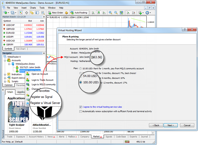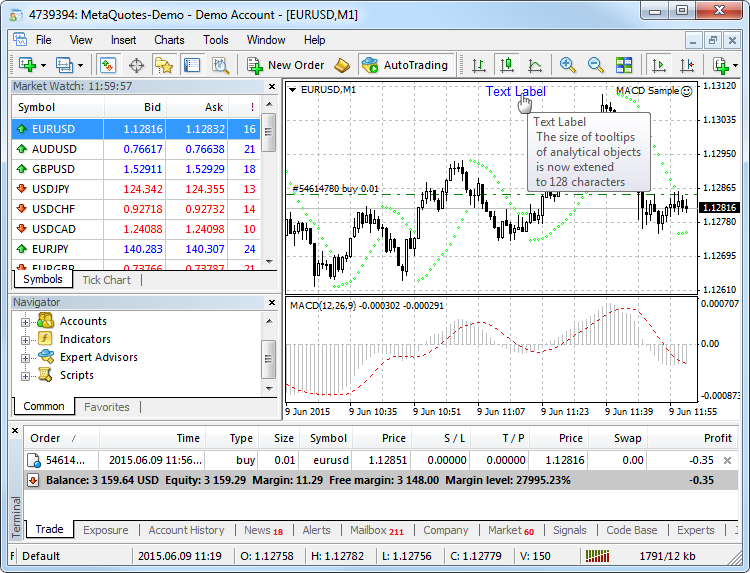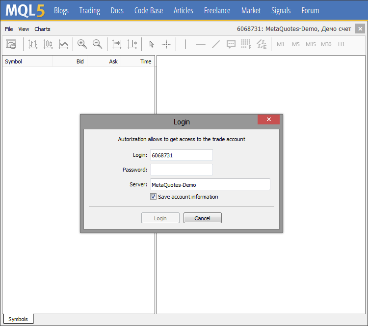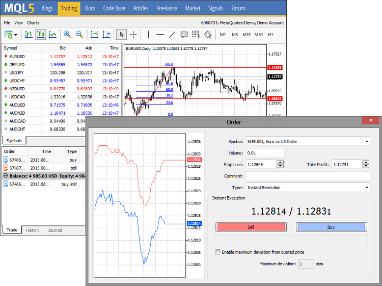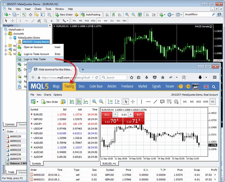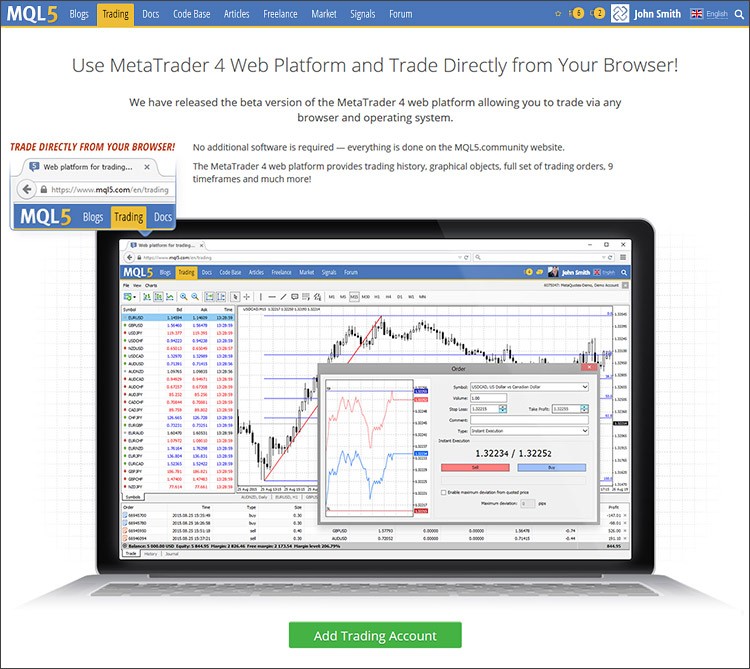 新機能を試すには、MQL5.communityに登録をし、新セクション『取引』に移動するだけです。ウェブプラットフォームのインターフェイスはデスクトップ版と同じもので、現時点では主要機能が利用できます。
