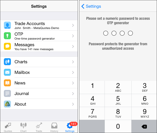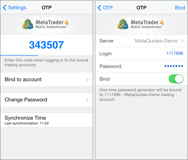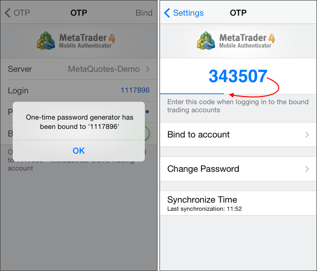 このパスワードを取得する為には、ご自分のスマートフォンのMetaTrader 4モバイルターミナルを開き、OTPページへ移動し、ワンタイムパスワード取得の確認コードを入力してください。.